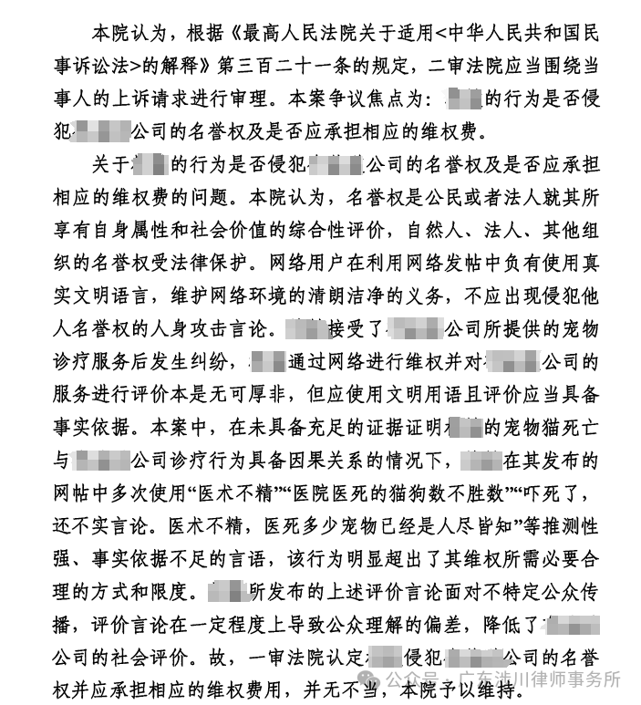 但网络用户在利用网络发帖中负有使用真实文明语言,维护网络环境的清朗洁净的义务,不应出现侵犯他人名誉权的人身攻击言论。本案被告接受了原告所提供的宠物诊疗服务后发生纠纷,被告通过网络进行维权并对原告的服务进行评价本是无可厚非,但应使用文明用语且评价应当具备事实依据。在未具备充足的证据证明被告的宠物猫死亡与原告诊疗行为具备因果关系的情况下,被告在其发布的网帖中多次使用“医术不精”“医院医死的猫狗数不胜数”“吓死了, 还不实言论。医术不精,医死多少宠物已经是人尽皆知”等推测性强、事实依据不足的言语,该行为明显超出了其维权所需必要合理的方式和限度,应承担侵权责任。